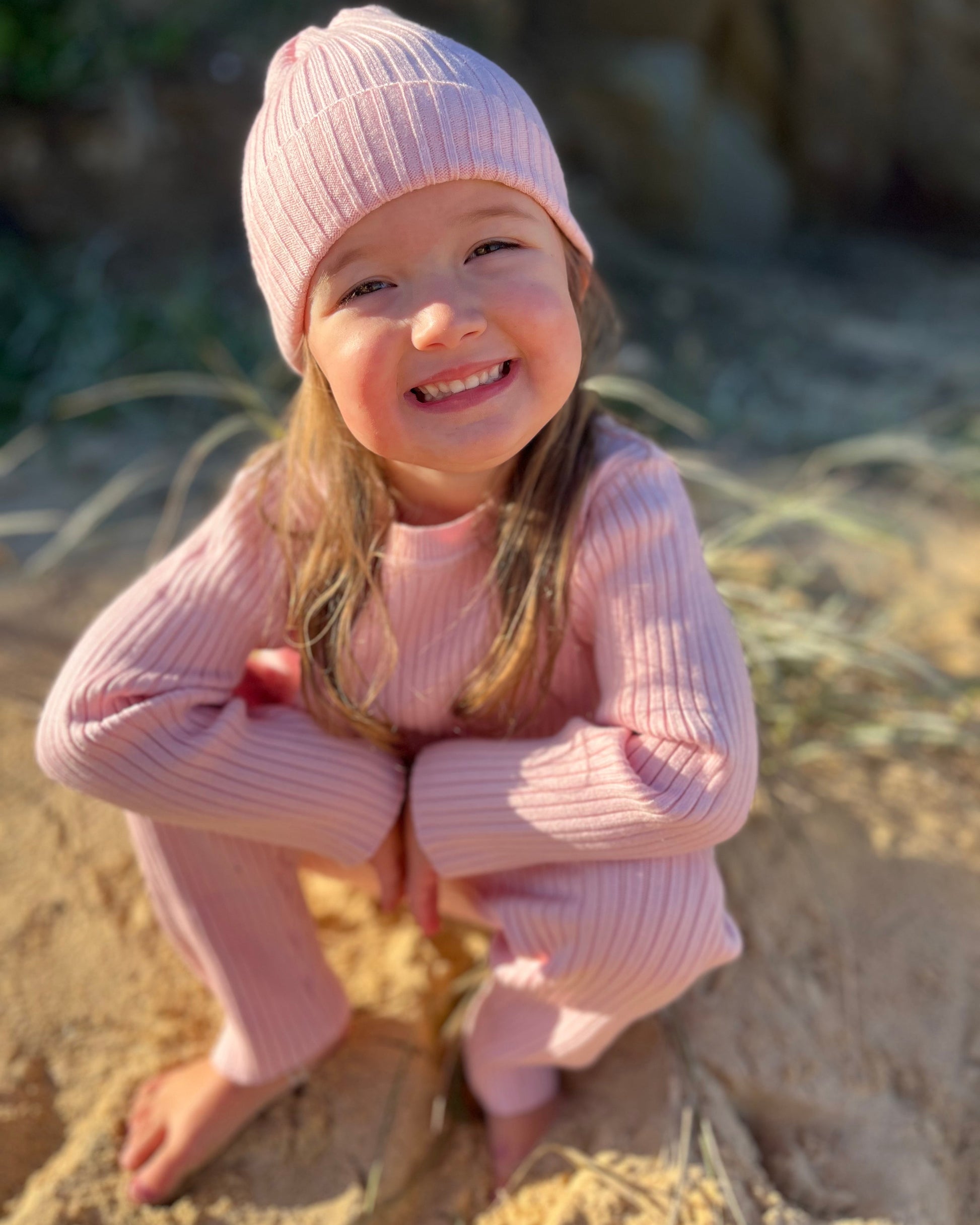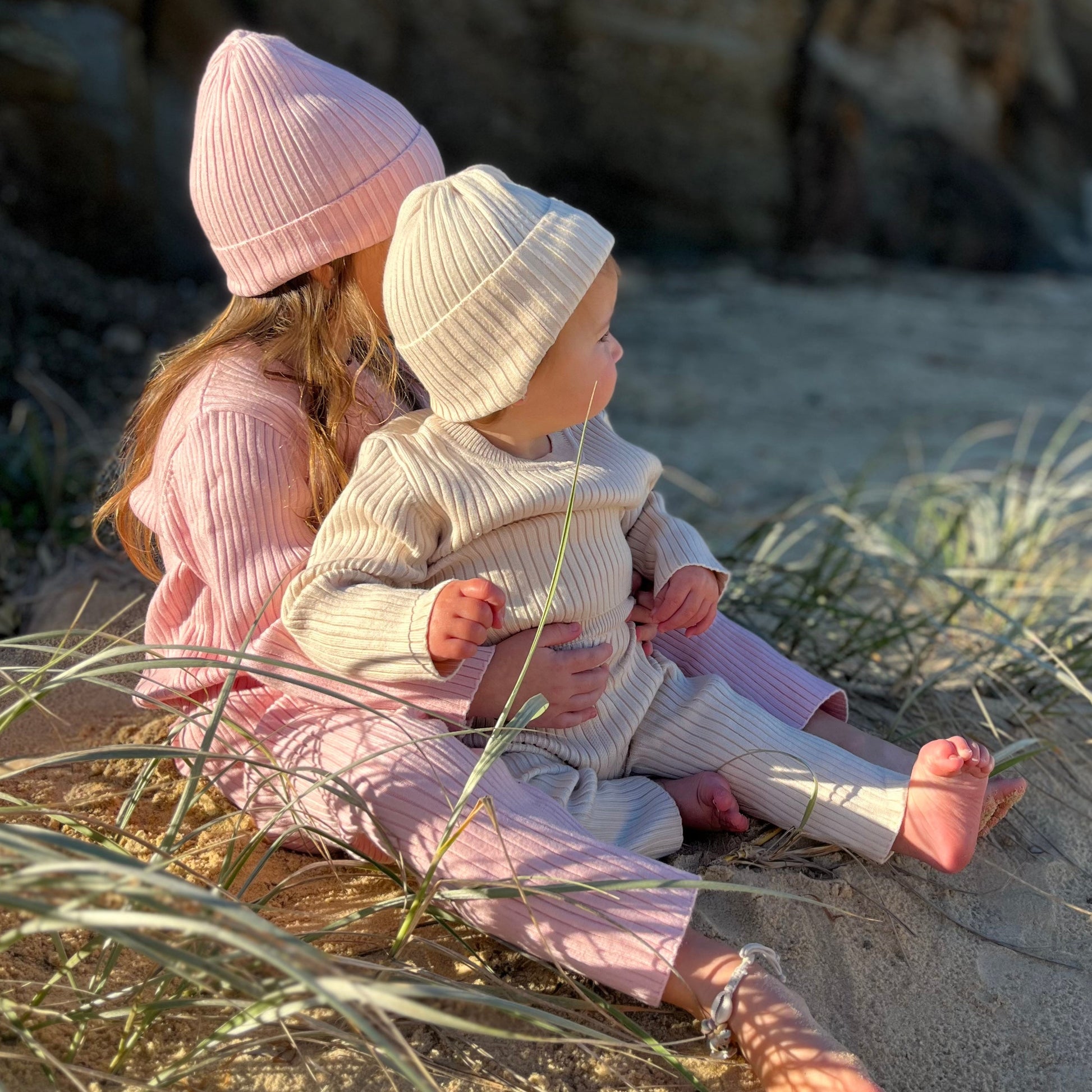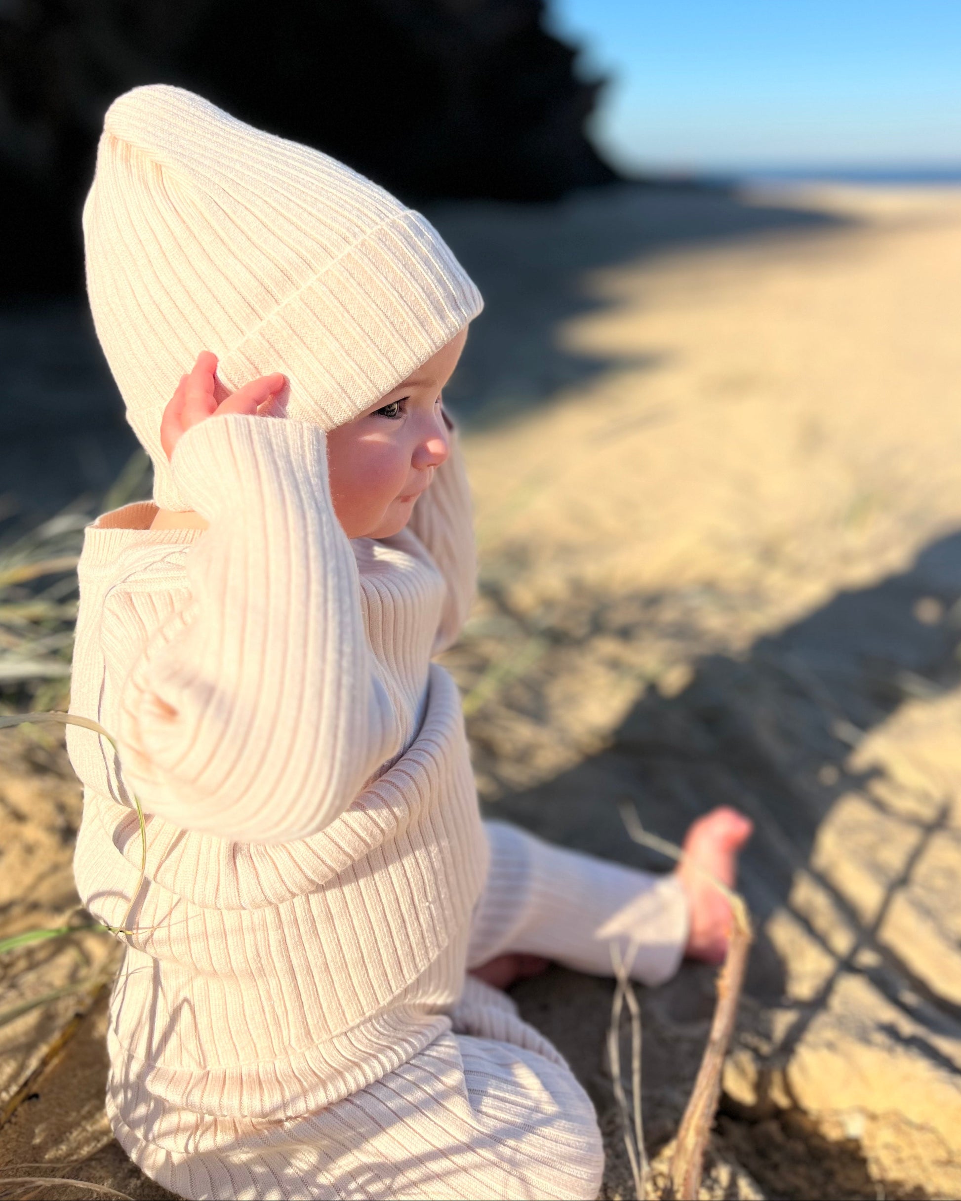 Our Indie 3 Piece Tracksuit is designed for ultimate comfort and style. The soft, ribbed knit fabric provides a cosy and flexible fit for your little one. This set includes a long-sleeved top, comfortable pants with a wide, gentle waistband, and a matching ribbed beanie for added warmth. The unique ribbed texture makes it perfect for both everyday wear and special outings (and lots of photos).