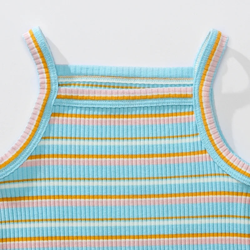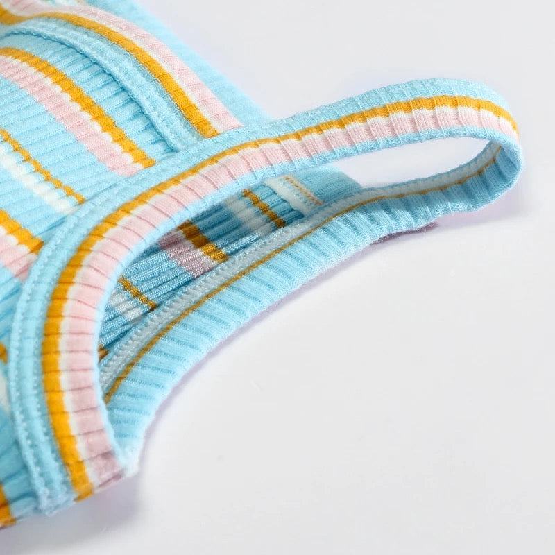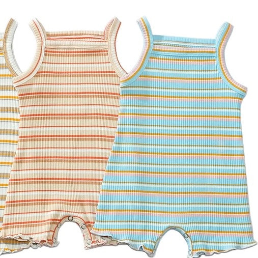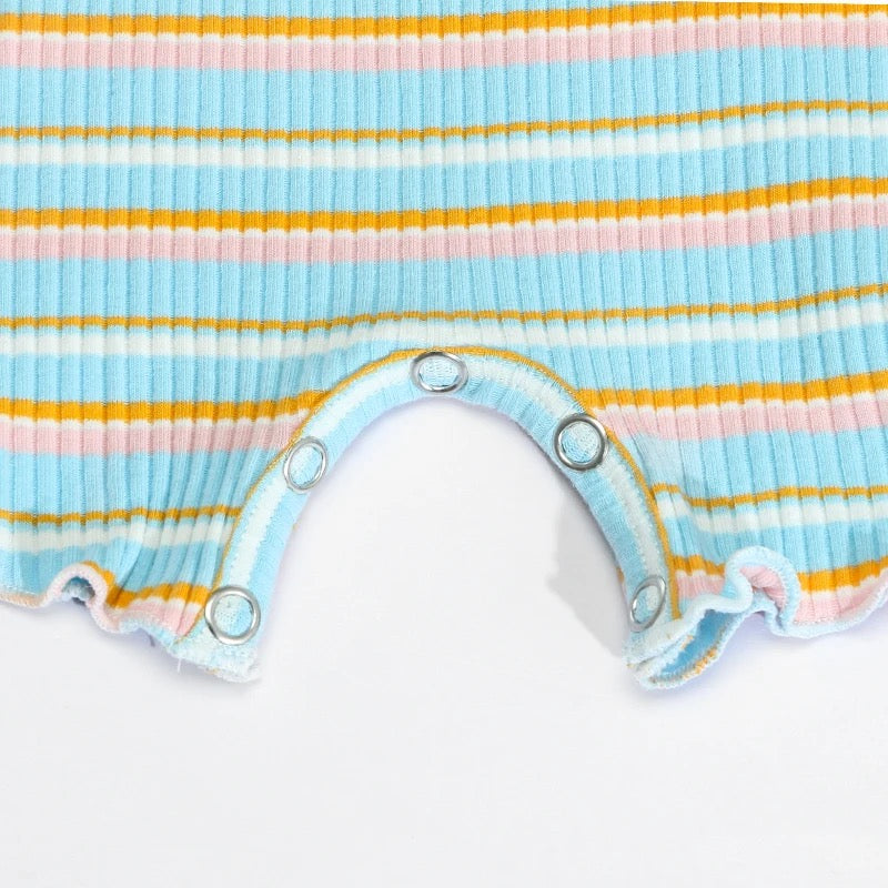 Old school is back in our adorable Retro Tank Romper! The light, stretchy fabric is a striped, ribbed cotton/spandex blend that keeps your little ones cool during summer and the colours are unisex - you can even mix and match siblings with the Retro Set. The bright colours make it easy to spot your little ones and add a splash of colour to their wardrobe.